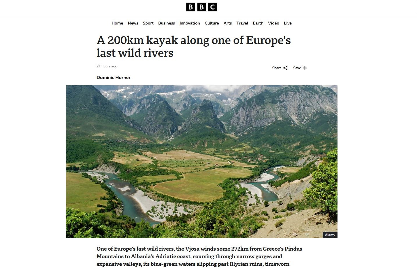 “Një nga lumenjtë e fundit të egër të Evropës, Vjosa përshkon rreth 272 kilometra nga malet e Pindit, në Greqi, në brigjet e Adriatikut në Shqipëri duke rrjedhur nëpër gryka të ngushta dhe lugina të gjera, ku ujërat e saj blu në jeshile rrëshqasin pranë rrënojave ilire, fshatrave të rrënuara nga koha dhe peisazheve të zymta malore”, shkruan Dominis Horner për britaniken BBC.