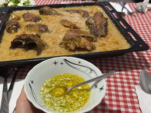 Miell misri i pjekur, i zier me lëngun e mishit të pulës, është ushqim...